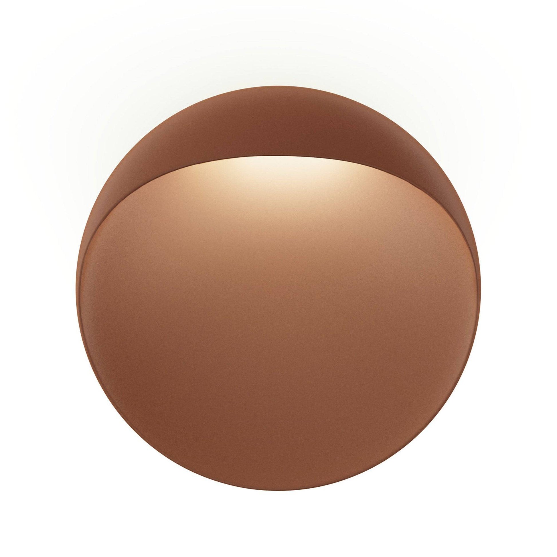 The Flindt Wall lamp is distinguished by a light egress from an opening in the top that sends light down the front of the lamp. This creates a subtle, glowing ring of reflected light on the transition between the concave and convex shapes. A portion of the light is distributed backwards, creating an indirect light component in the shape of a half-moon.