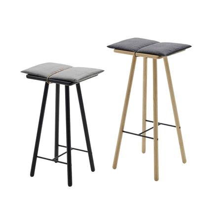 The stool is crafted from oak, with a woollen cushion secured by a braided leather strap and a metal H-frame.