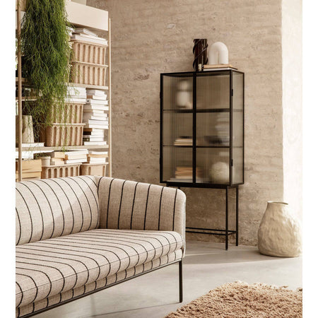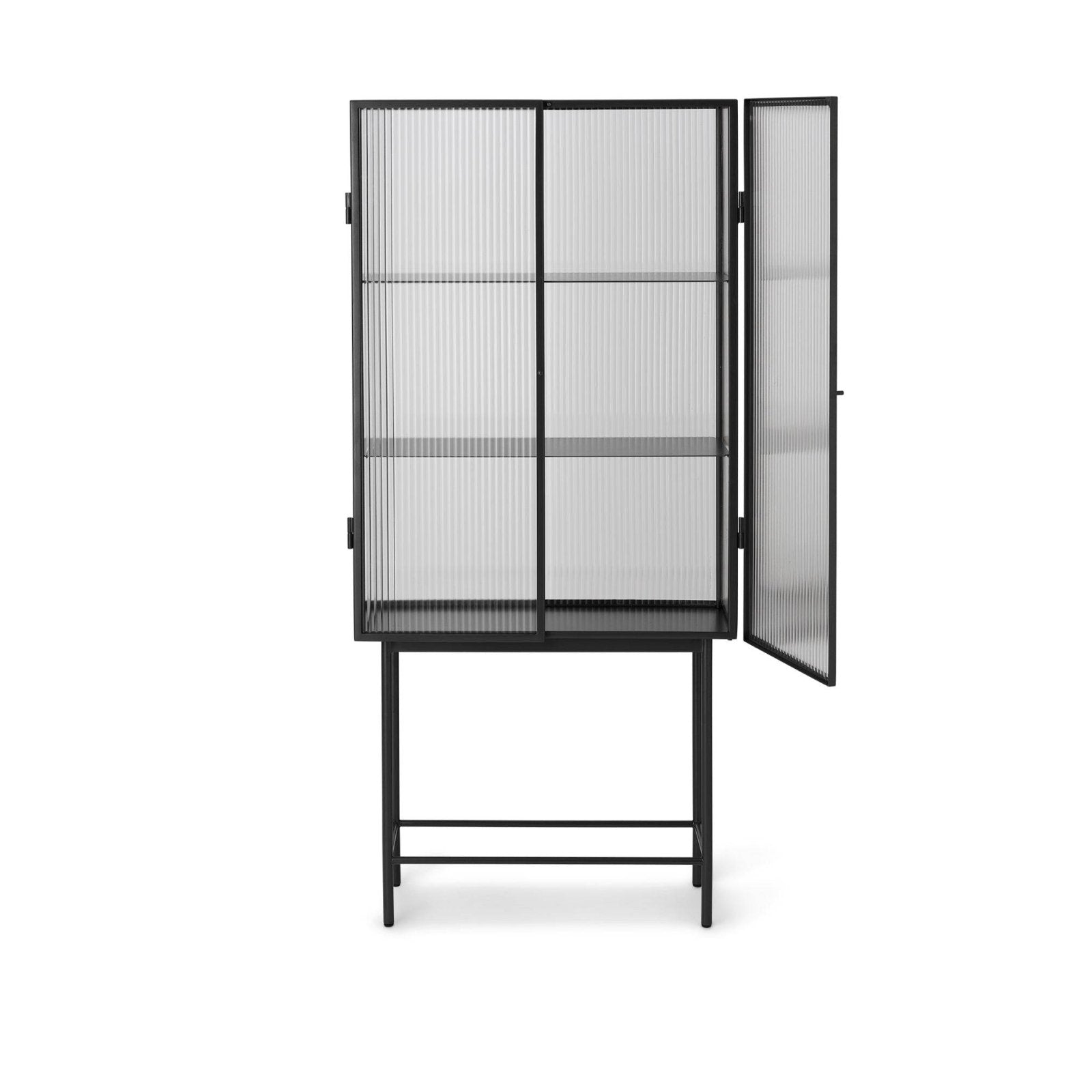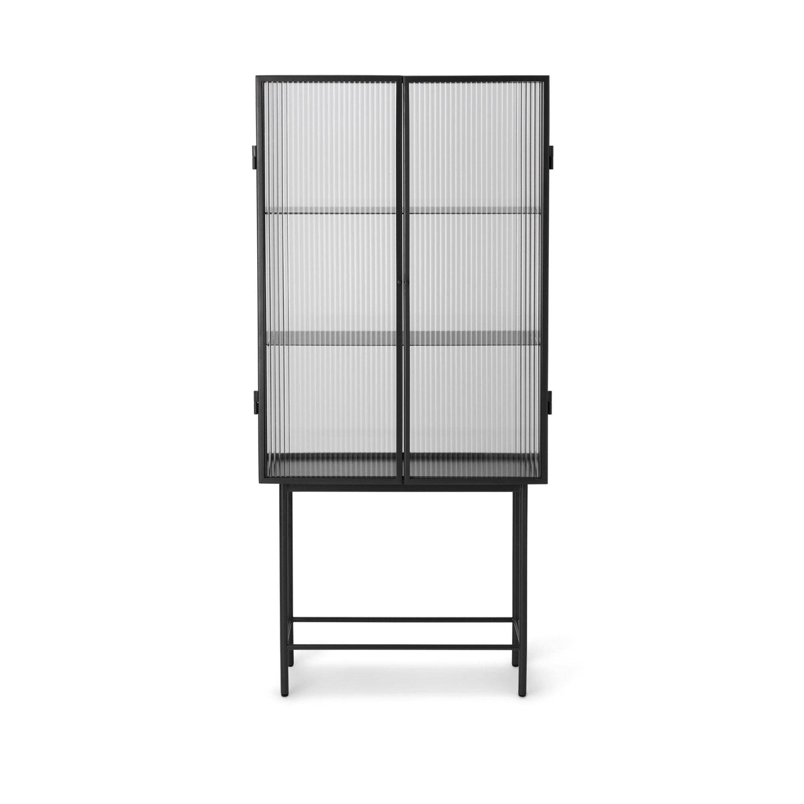 Opposites attract on this cabinet, crafted from sleek powder coated metal and corrugated glass.