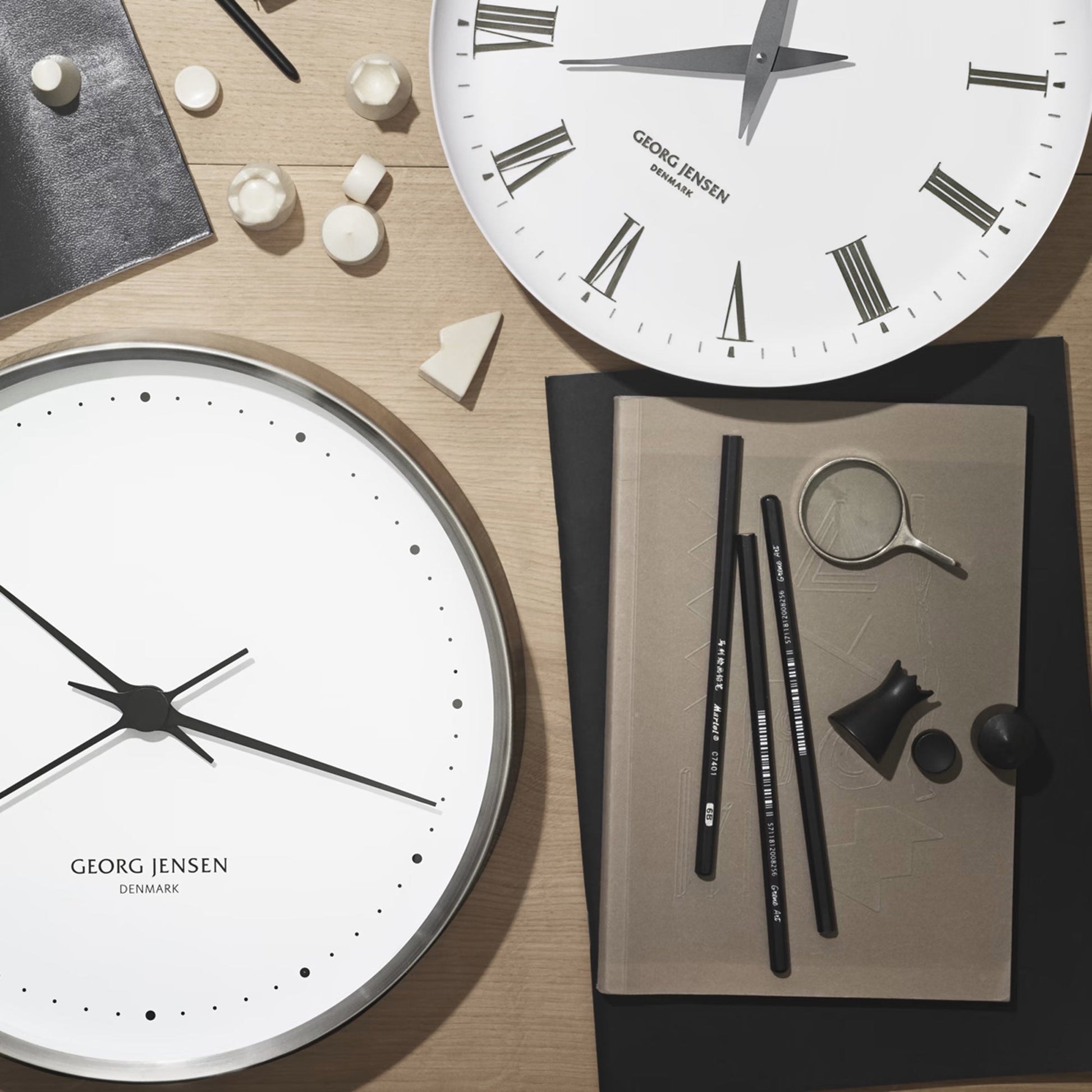 Black dots replace the numbers that are traditionally used on a watch dial. This touch has been carried over in many subsequent Georg Jensen watch collections. It is a good example of the collaboration of simplicity and quality that has been a hallmark of Georg Jensen since its beginnings. The Koppel clock is a bold meeting of style and substance.