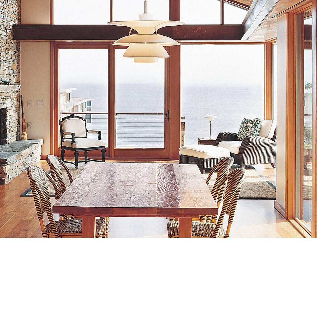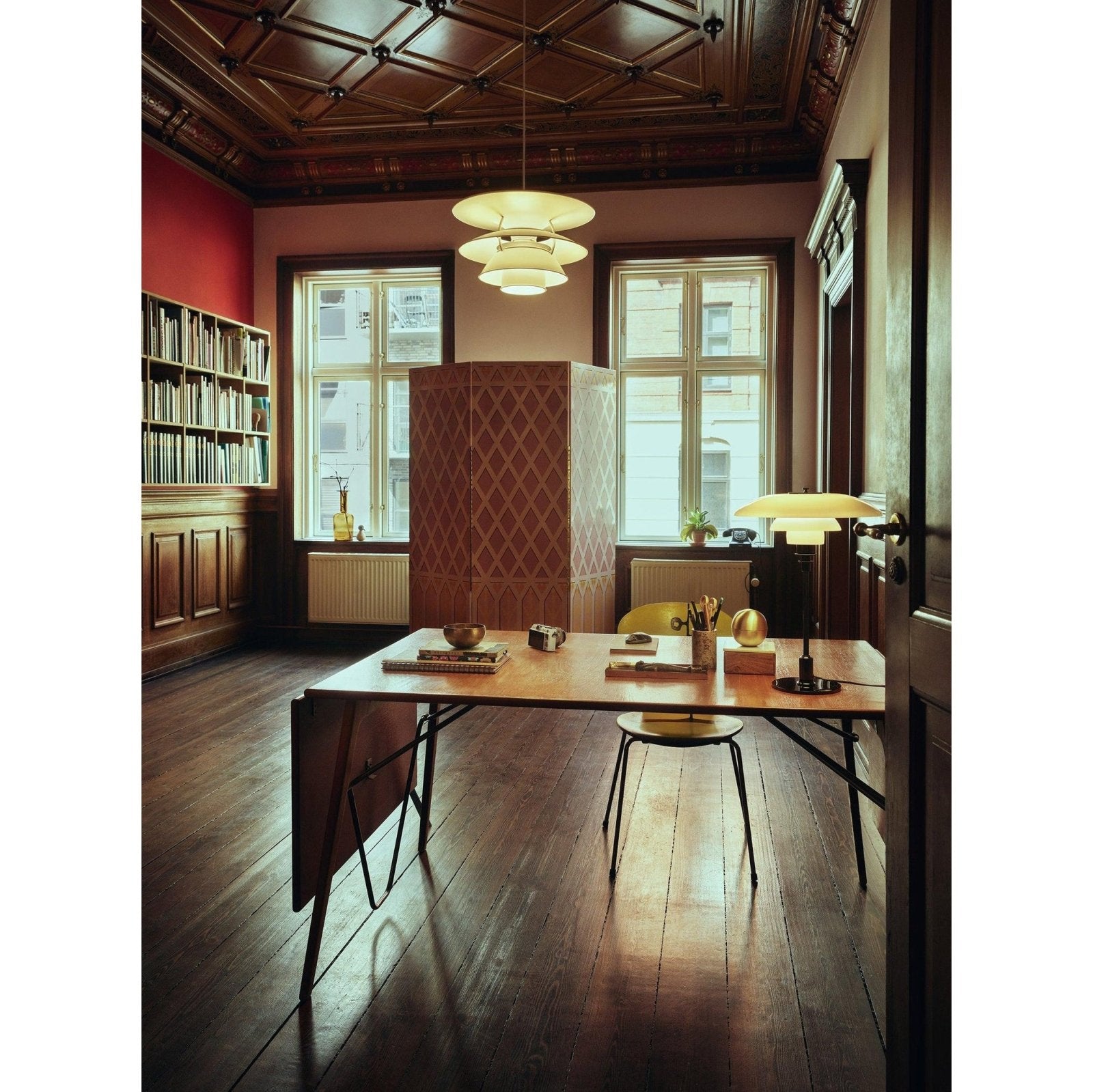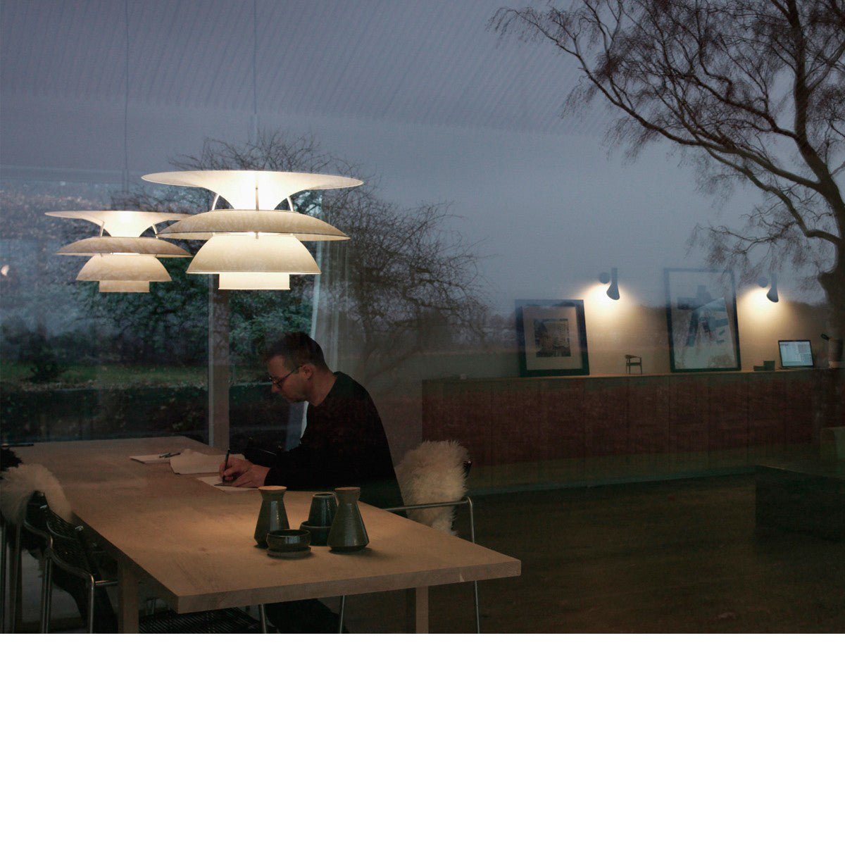 The PH 6½-6 Pendant Light from Louis Poulsen has a trumpet-shaped top shade which provides illumination of the area above the three shades, which primarily direct the light downwards.