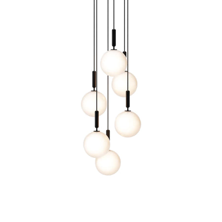 Miira 6 Large in mouth blown Opal White glass and RockGrey finish. Incl. Ceiling plate. The significant details of Miira are the fine curves and thin neck that gives a graceful apperance. The Miira Collection features mouth blown glass globes in both Opal White and Optic Clear. The Optic glass has slight variances due to the handmade process, which makes each piece unique. Miira collection is designed with the chandelier as a centre and expands into a complete series of lights, manufactured in the highest quality. Miira 6 Large Chandelier can be adjusted in a long span, suitable for halls, stairs and corner spaces.
