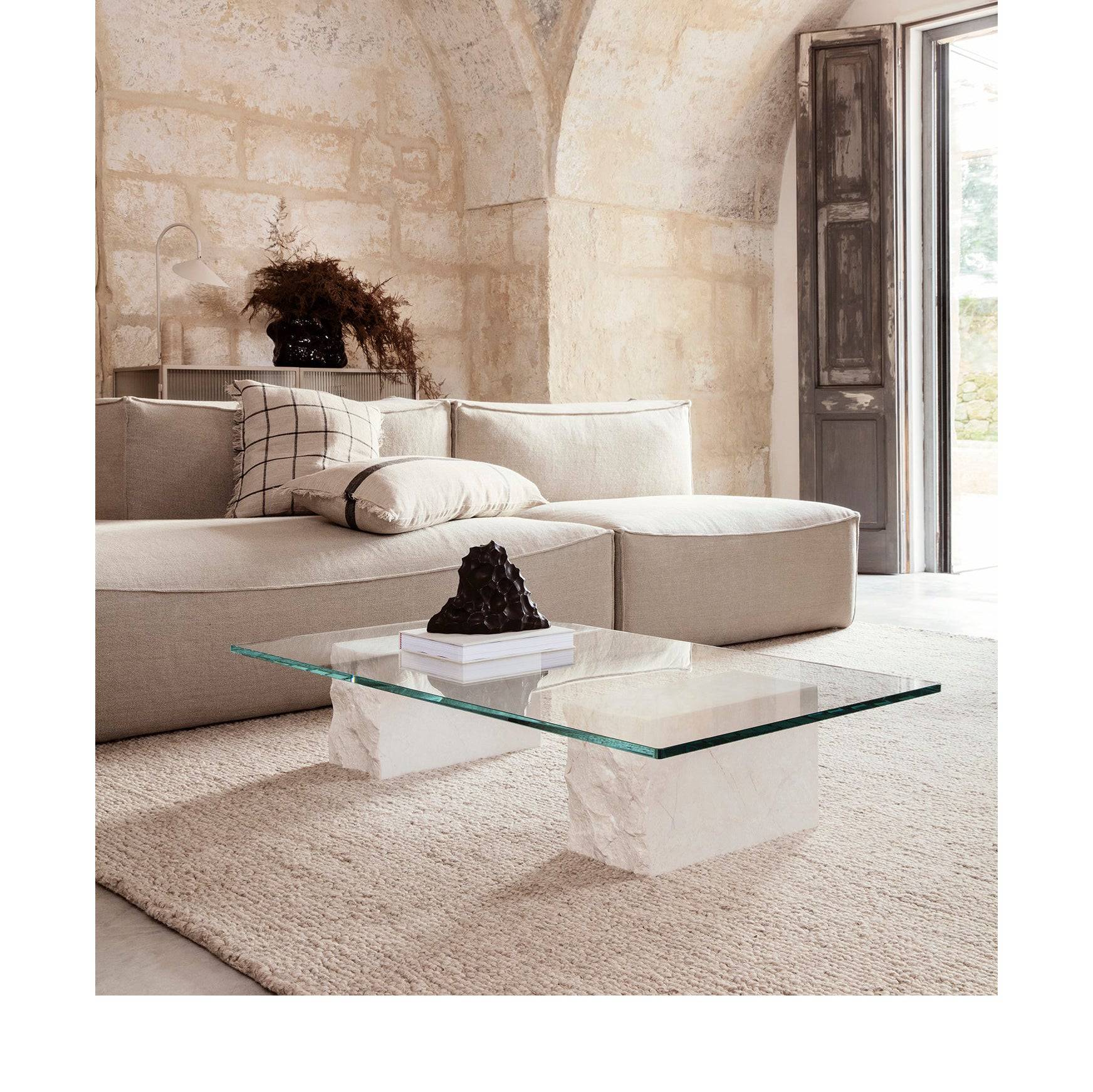 A harmonious marriage of natural materials and contrasting finishes, the Mineral Coffee Table by Ferm Living showcases the intrinsic beauty of natural Bianco Curia marble and glass.