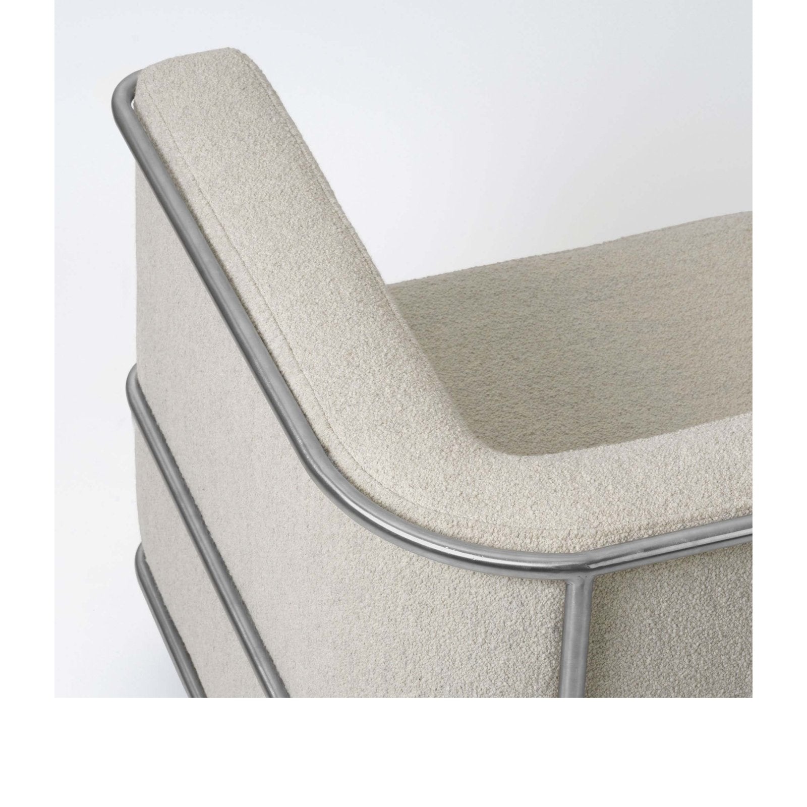 The upholstery follows the curves of the stainless steel frame in the most elegant way forming the backrest and armrest of the sofa in one single movement / stroke.