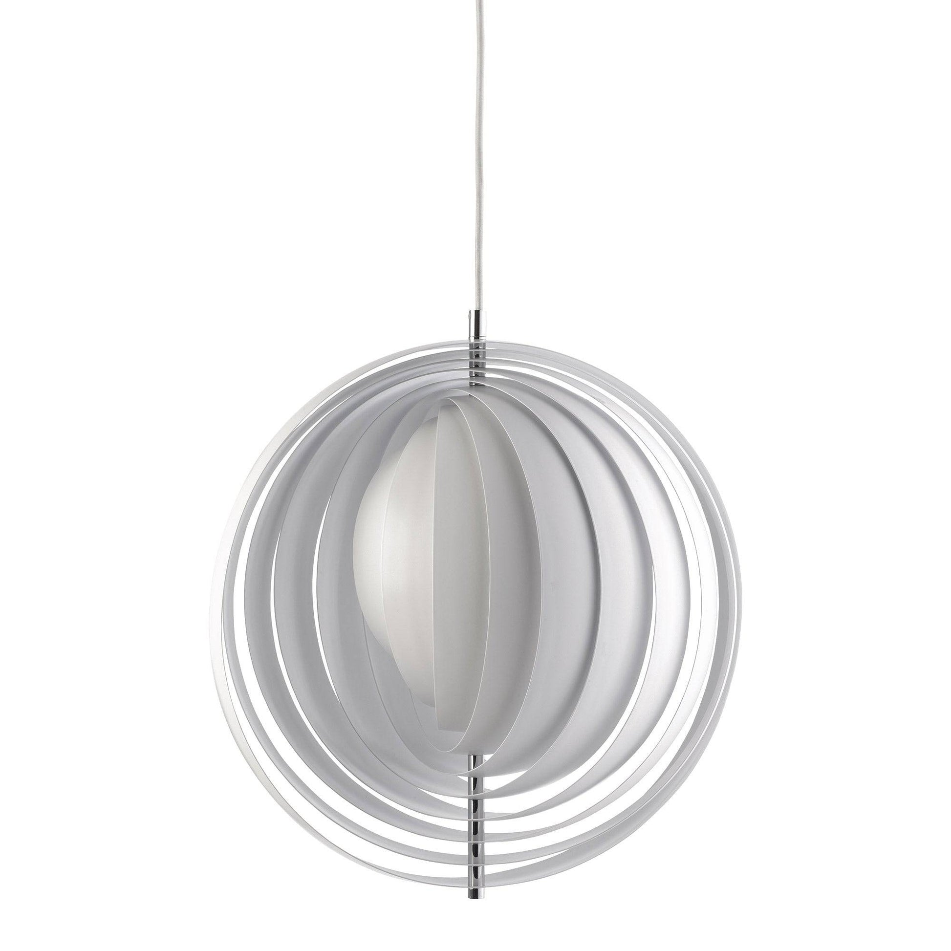 The lamp consists of a large number of ring-shaped discs, which are suspended around the centrally located bulbs. The fan-shaped discs hide the bulb and at the same time serve as reflectors, through which a soft light is spread throughout the room. The Moon pendant is one of Verner Panton's earliest luminaires. The Moon pendant justifiably gets its name from its shape and the quality of light coming from it.