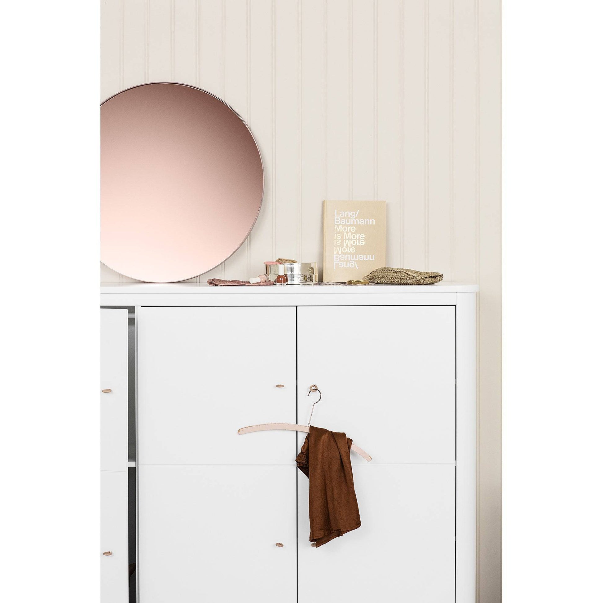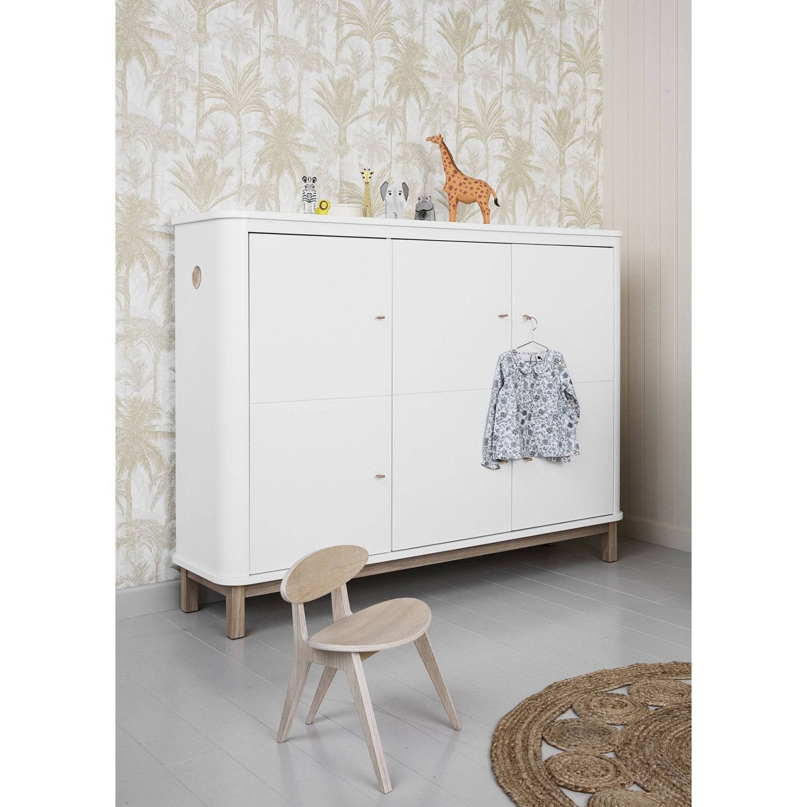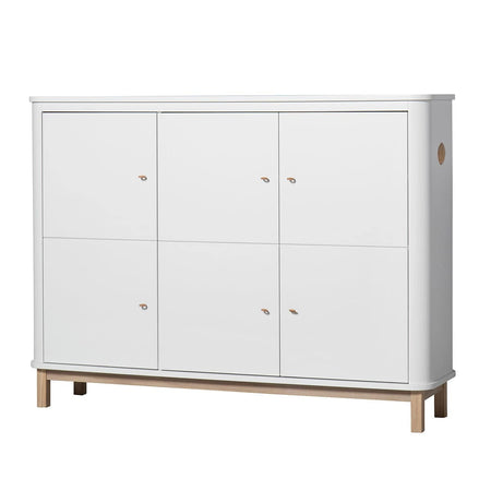 Wood multi cupboard with 3 doors. As the name suggests, the new cupboard is designed as a piece of furniture with multiple functions. Its modest depth and height provides compact storage without wasting unnecessary space. At the same time, the rounded form of its edges, give the multi cupboard a visual lightness and allow it to appear smaller than it is. The multi cupboard’s small dimensions make it ideal in a children’s room where space is tight. The cupboard is also suitable for shoes, gloves and hats near the front door – equally so in the kitchen for ceramics and dining service. Wood multi cupboard is, like the other furniture in the Wood Collection, defined by the refined details. A special ‘soft lock’-function dampens the closing of doors, so small fingers won’t get pinched. The multi cupboard comes with 3 narrow shelves and 3 wide shelves, one of which is fixed in place. The cupboard has 3 doors which are divided by a horizontal accent. The door’s division – almost like a piece of folded paper – add to the sense of balance and give the multi cupboard its character. The innovative pulls made from loops of full grain leather are paired on the cupboards 3 doors.