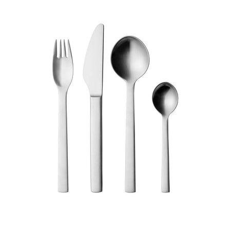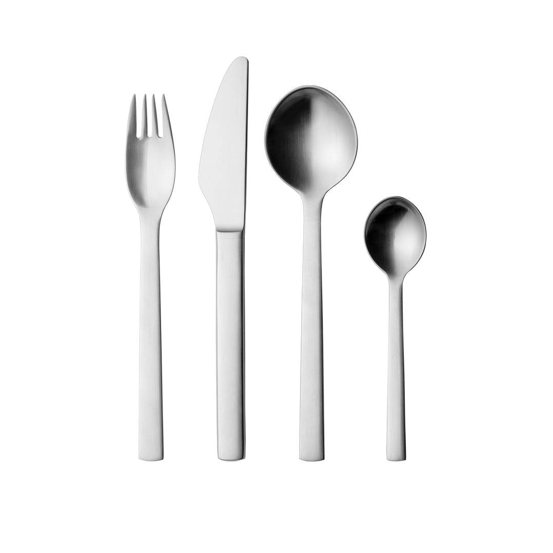 The set of 16 comprises 4 places of a dinner spoon (3320011, 195mm), a dinner fork (3320012, 191mm), a dinner knife, (3320017, 210mm) and a teaspoon (3320033, 138mm). It is crafted from stainless steel with a matte finish and is suitable for a dishwasher.
