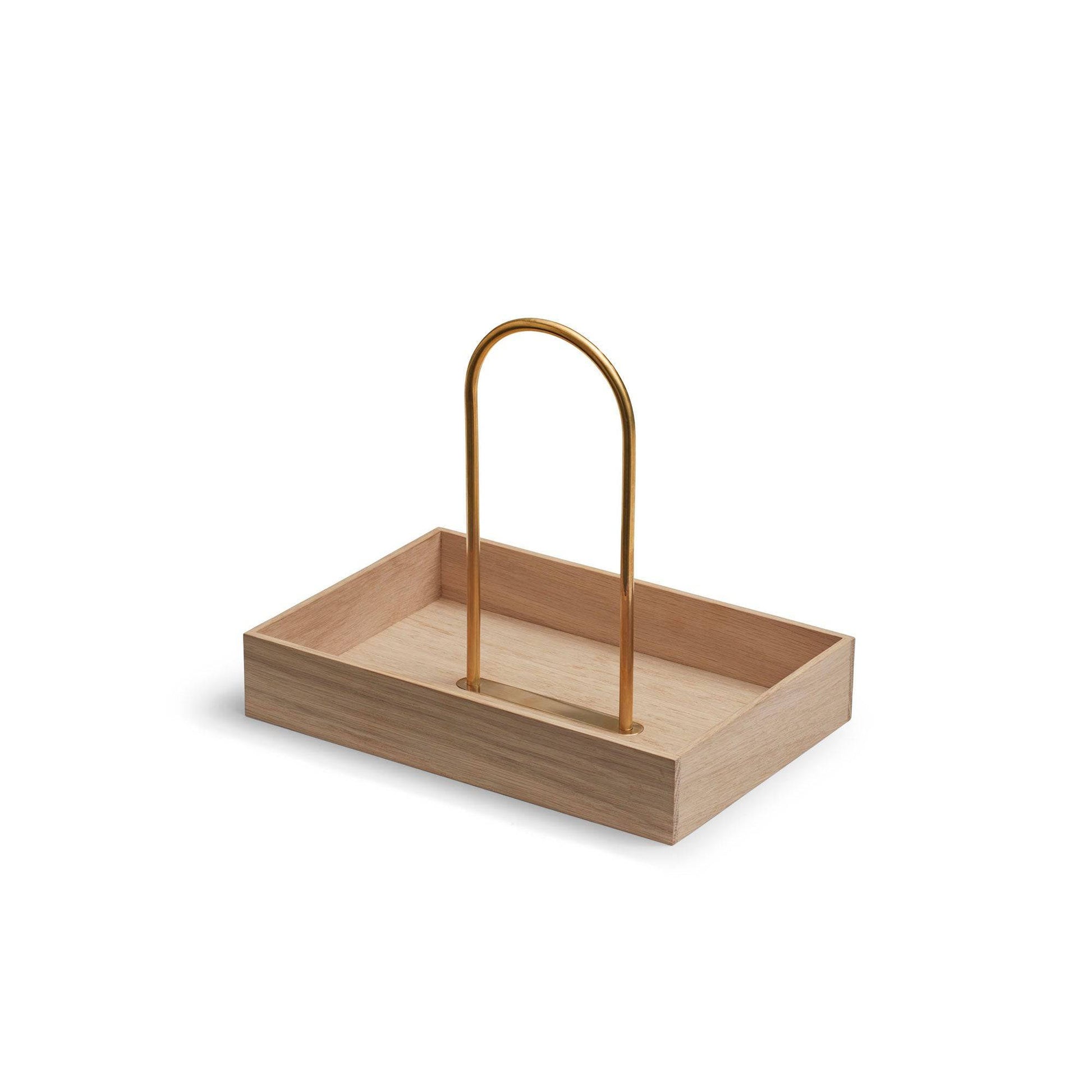 The caddy is crafted in untreated or coloured oak, with an arched handle in the centre.