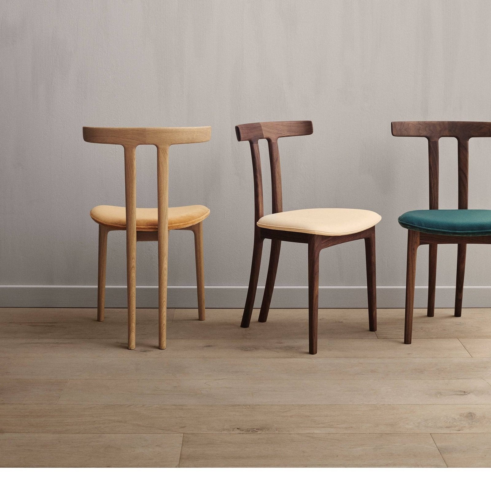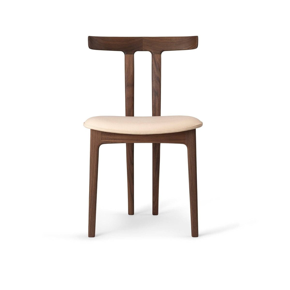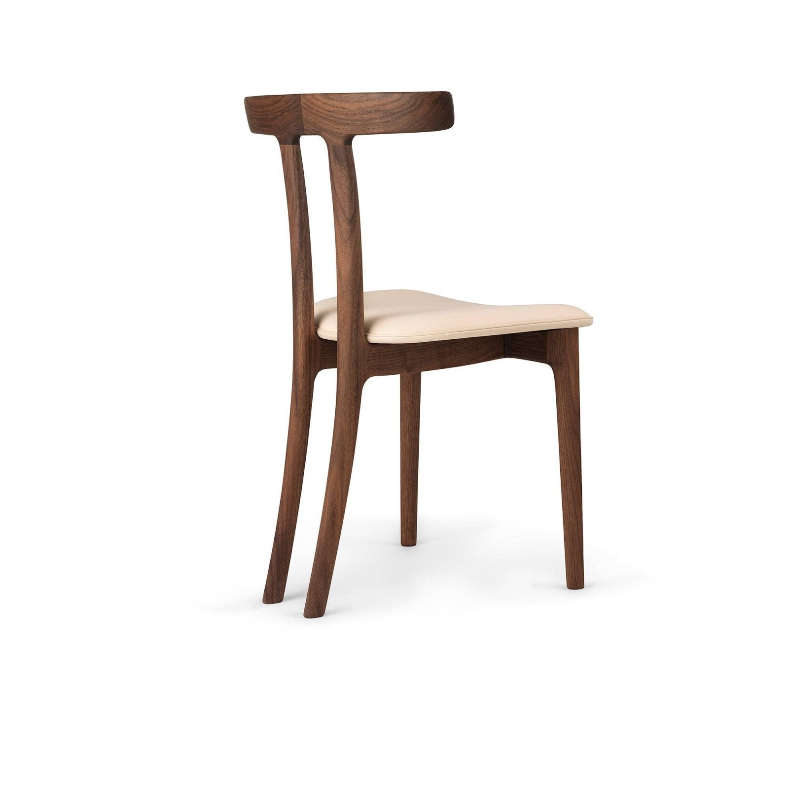 Distinctive detail: The T-shaped backrest merges seamlessly with the angled rear legs, giving the illusion of a three-legged chair.