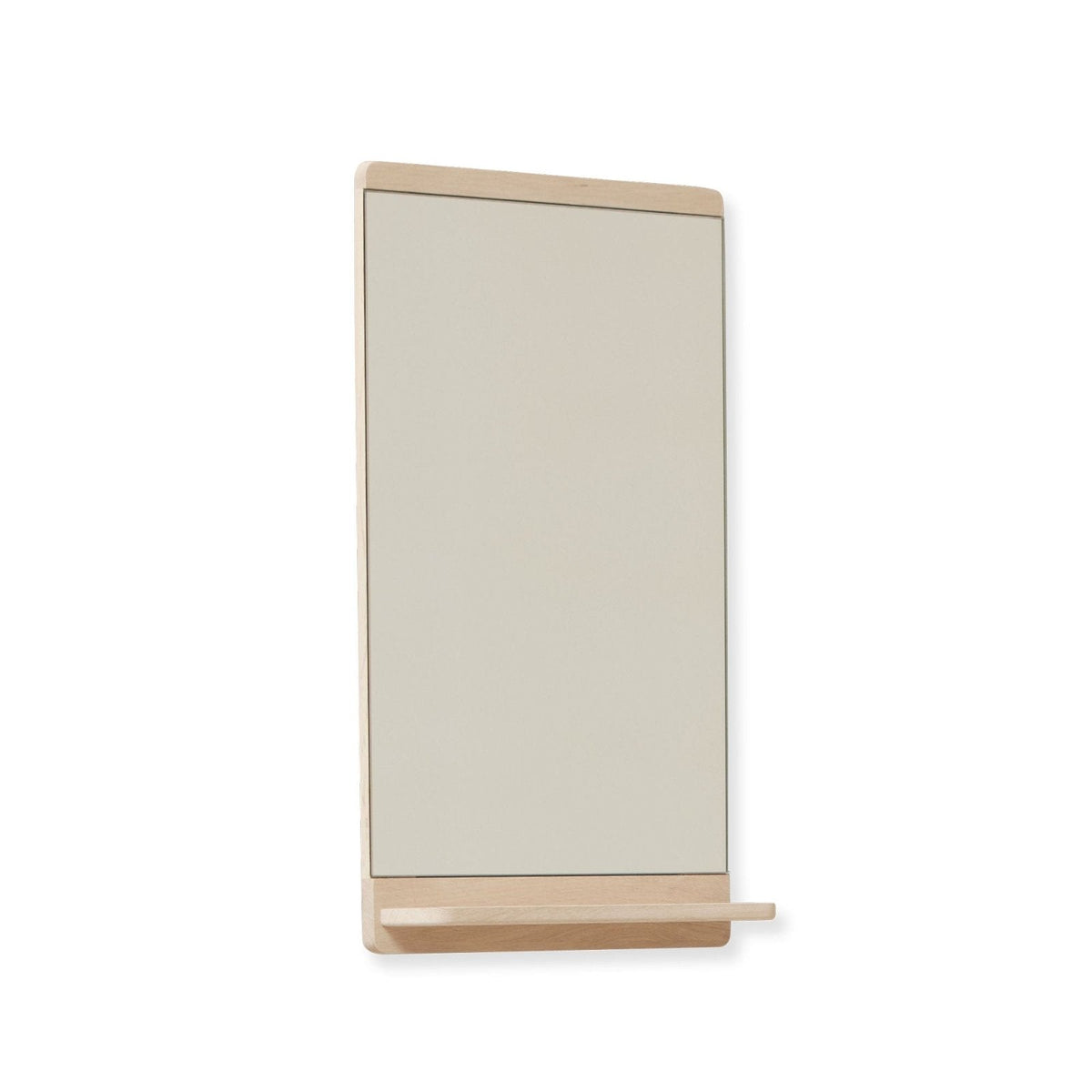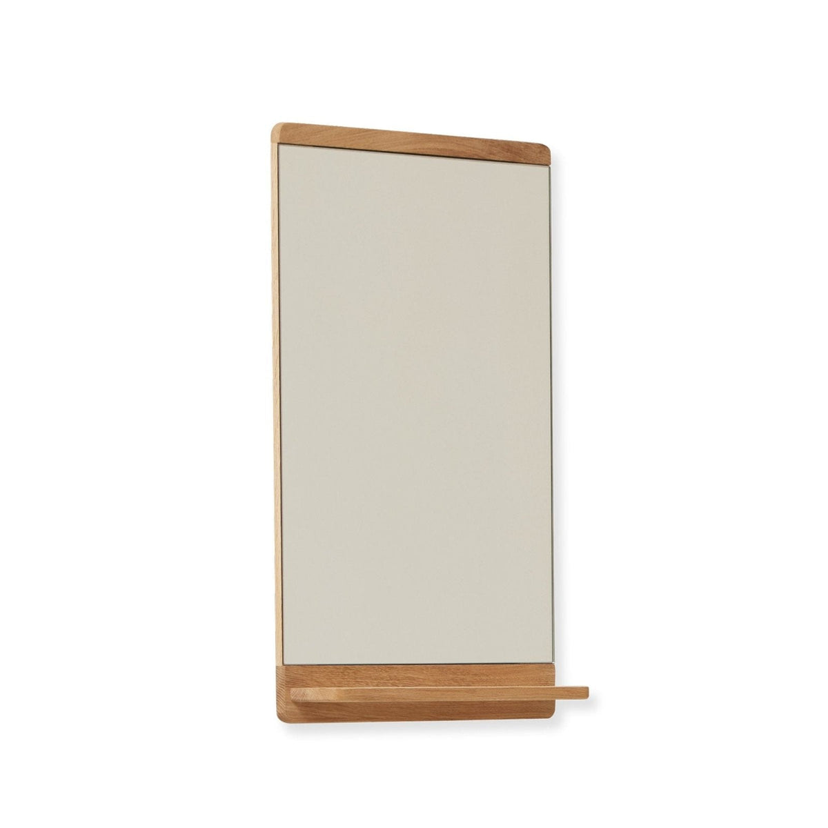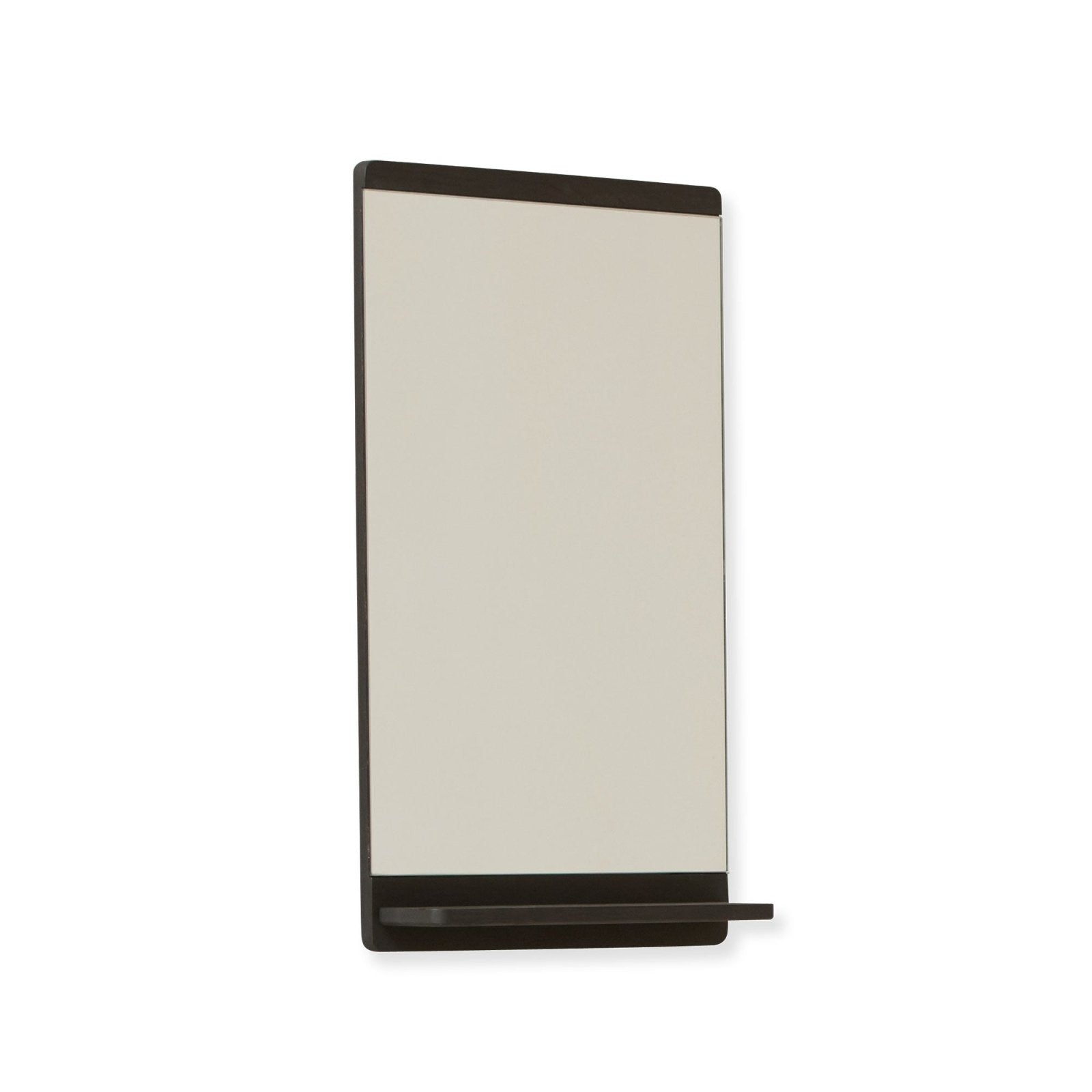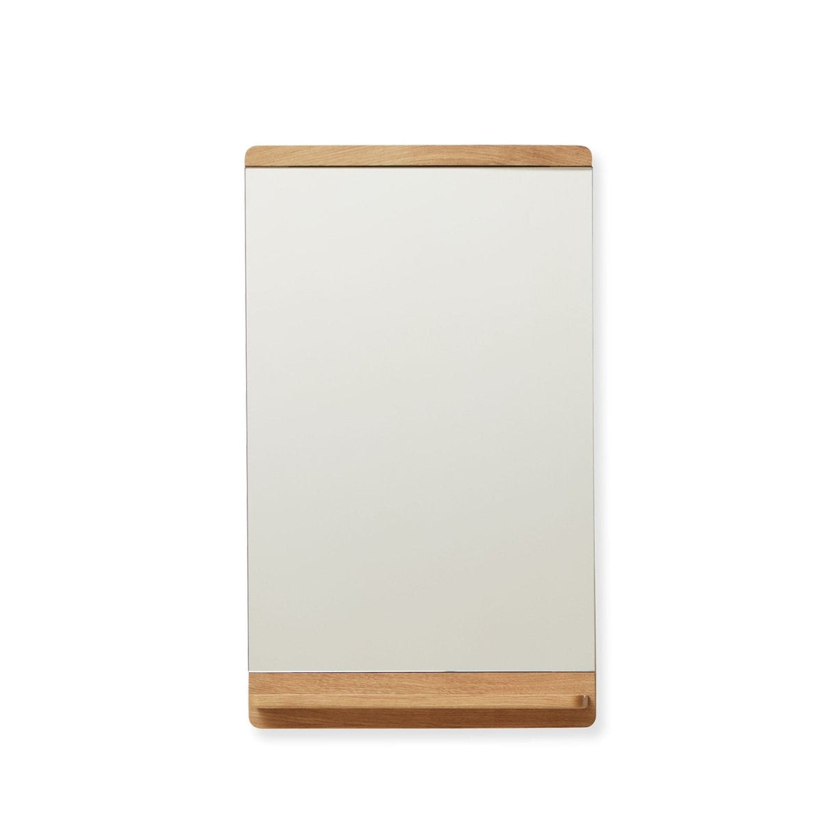 Functional elegance: A slim wall mirror paired with a practical shelf featuring a groove for storing small items.