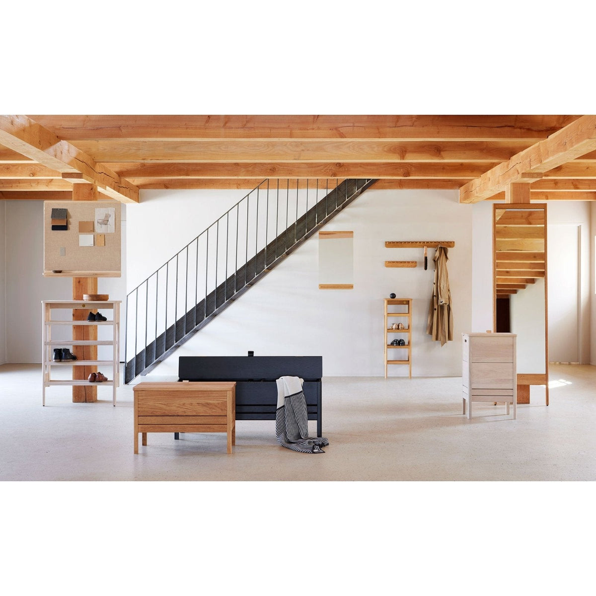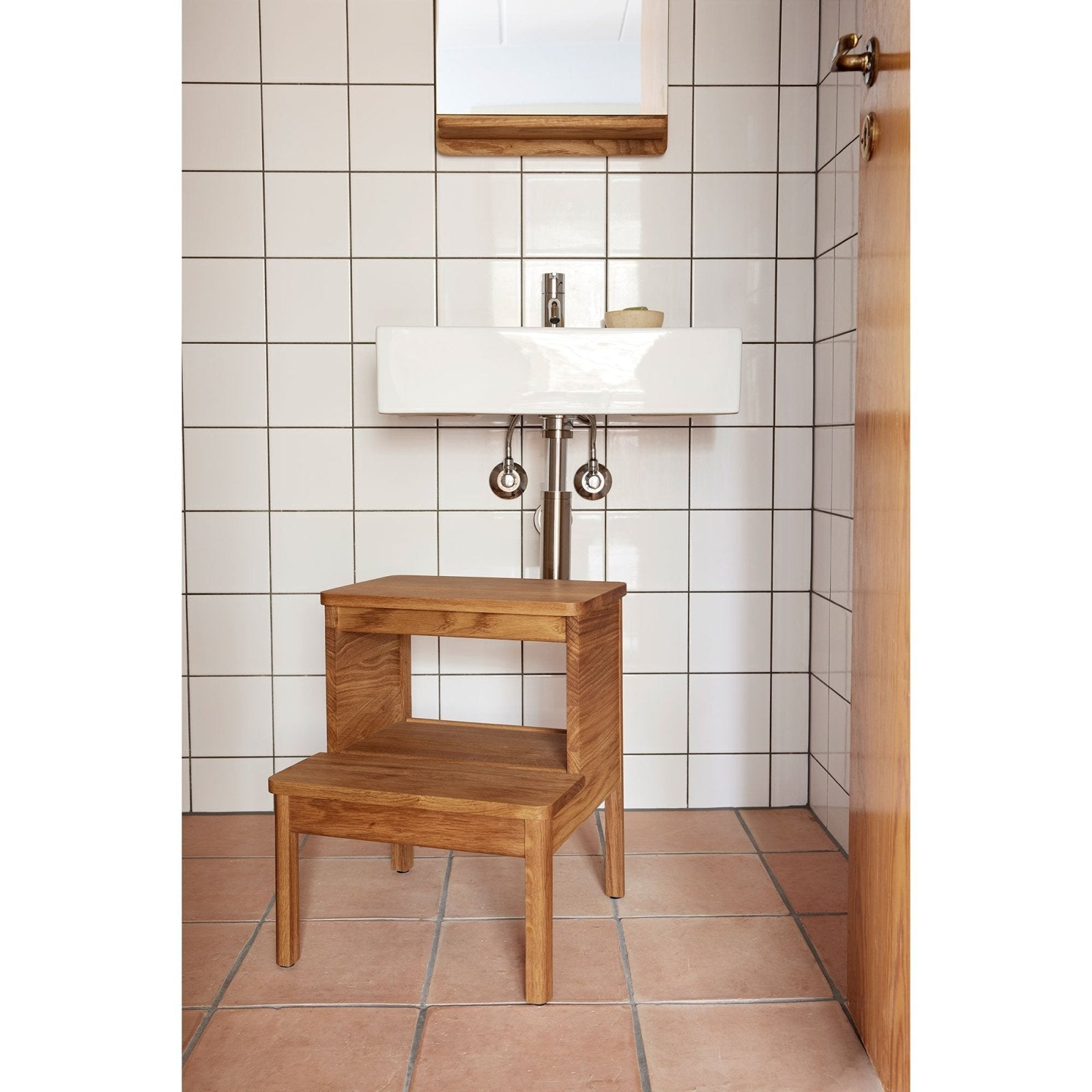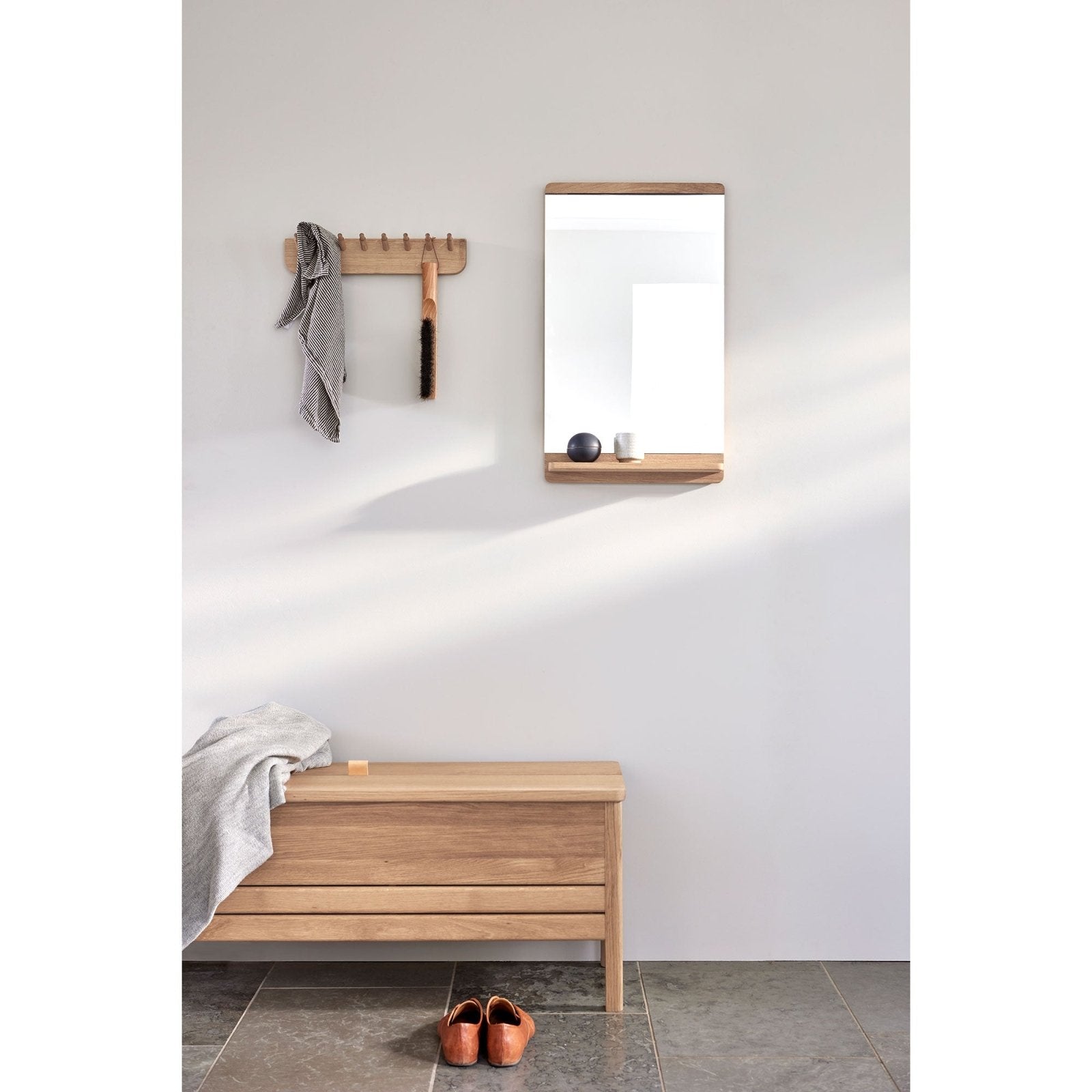 “We wanted to make a classic and slim mirror with visible soft wooden details that lift it from the wall. The flat panels at the top and bottom give the mirror a warm expression as the wood grain becomes visible. The wooden strips that surround the back of the mirror all have a large radius which creates a soft shadow on the wall.”