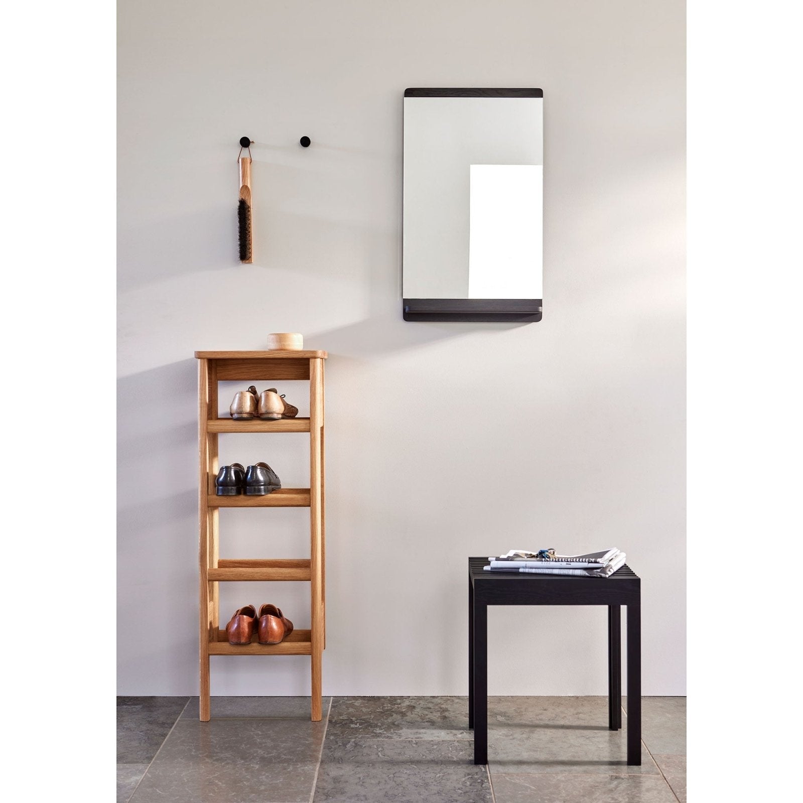 The Rim Wall Mirror by Form & Refine is an elegant and practical design piece that combines a slim mirror surface with a discreet wooden shelf. With its infinity glass finish and refined wooden details, it enhances modern living spaces while offering everyday functionality.