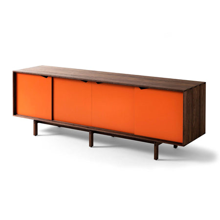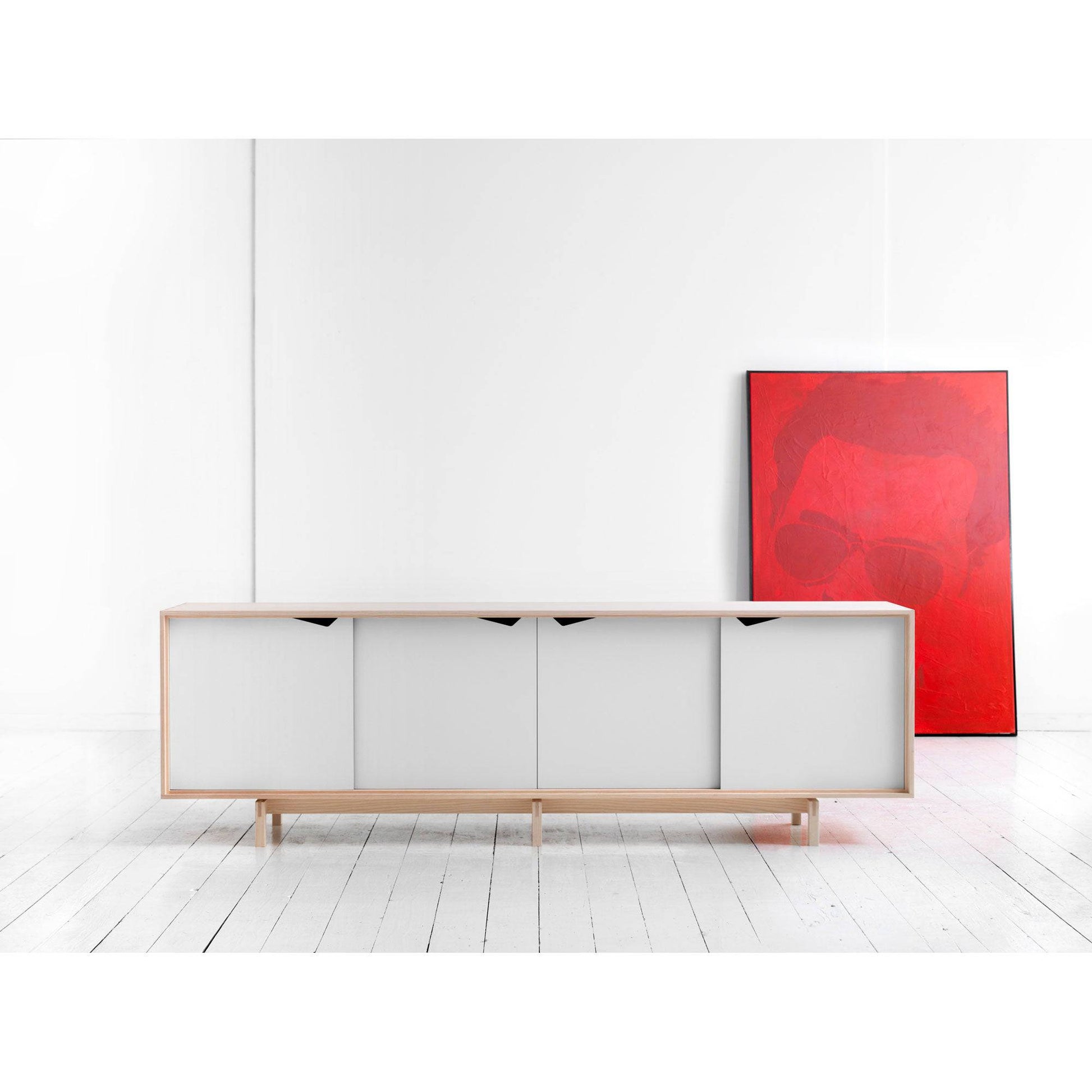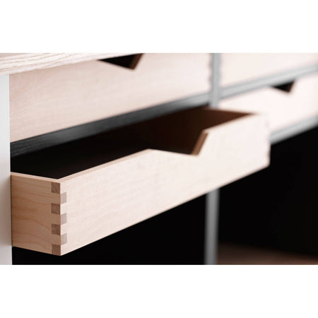 The sideboard is built without hinges or handles. The doors slide effortlessly in the grooves that hold them in place. There are no metal rails or bearings. And the same applies to the drawers, which run on the shelf that supports them. Again byKATO have gone for a design based on simple, logical, back-to-basics high quality craftsmanship. The type of furniture produced by cabinetmakers in times gone by.