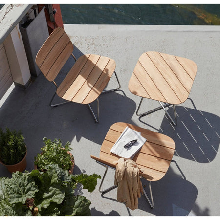 The chair combines a stainless steel frame with teak planks for a durable, weather-resistant construction.