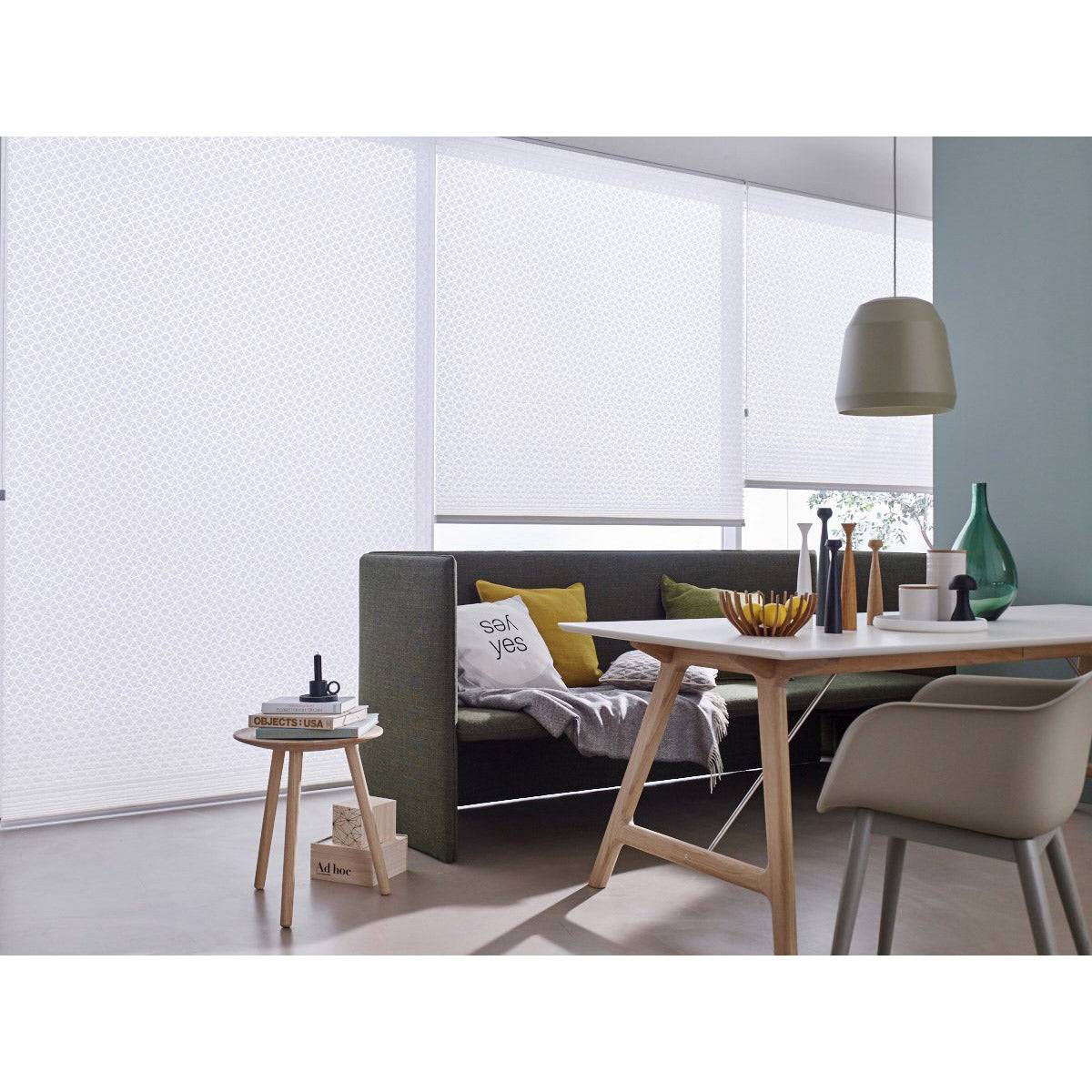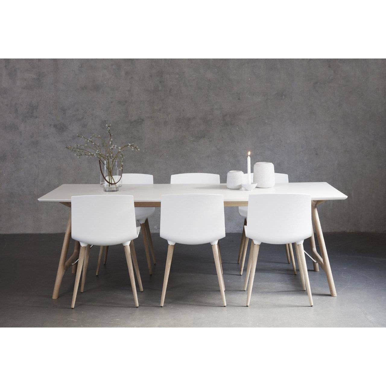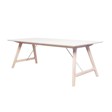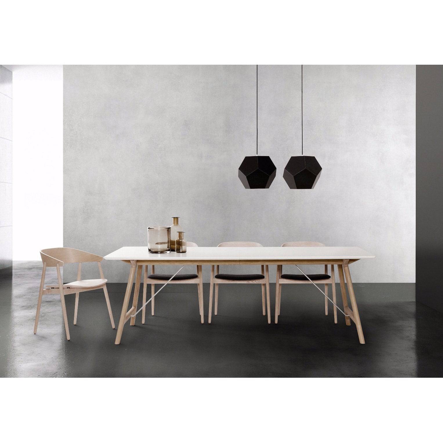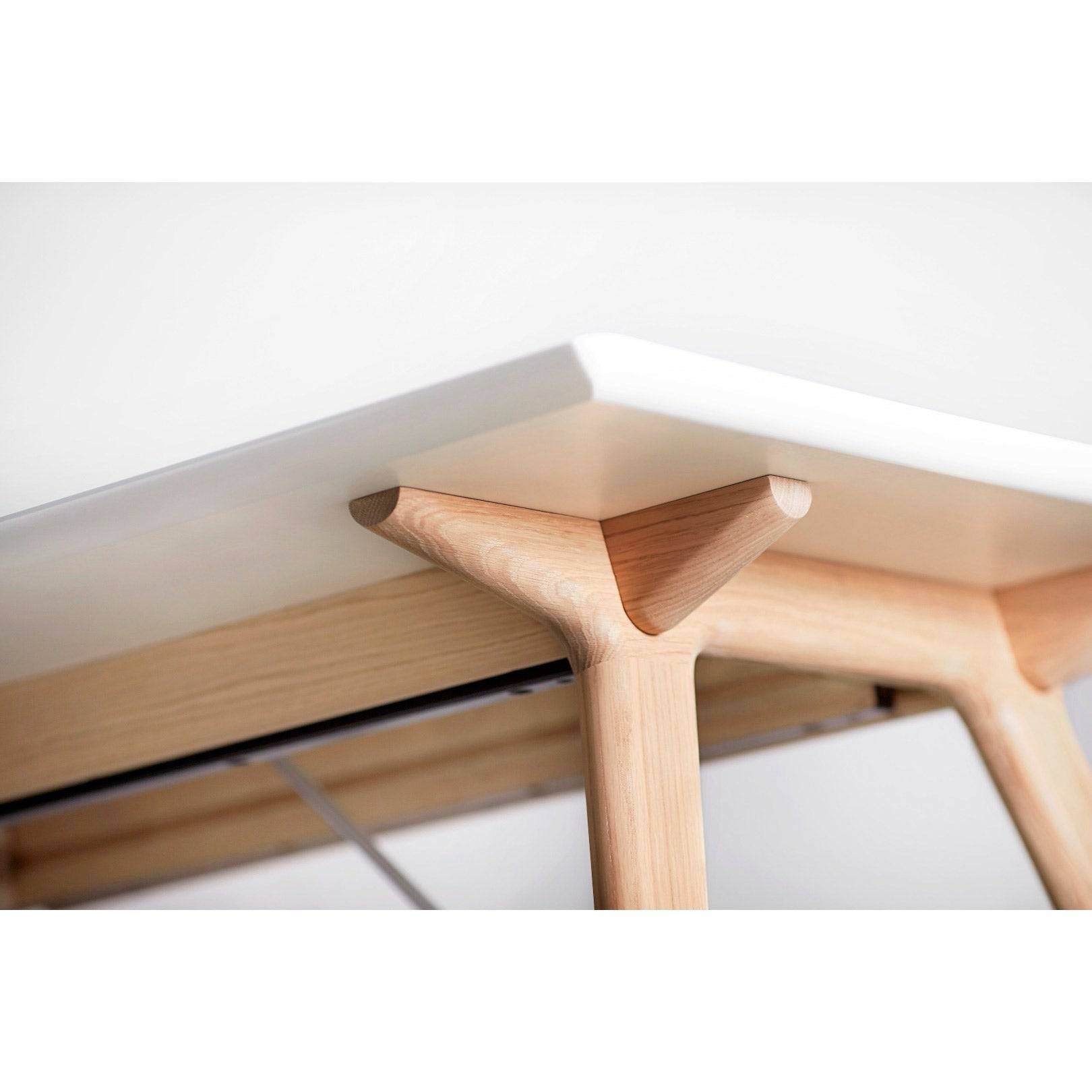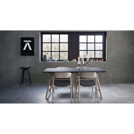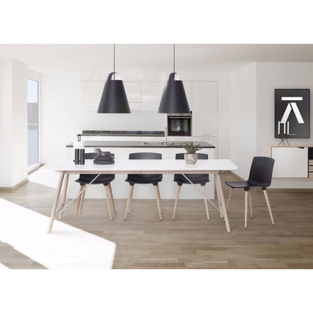 The tabletop is made of solid coloured white laminate or black fenix laminate and the legs are in solid oak. You can also choose a black base.