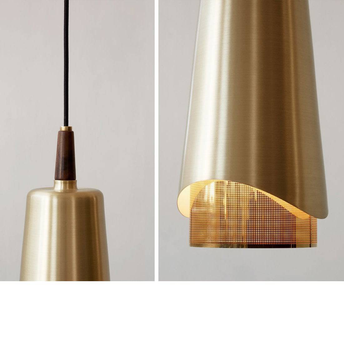 A perfectly symmetrical, sleek design, the striking pendant emits a beautiful downward light to illuminate surfaces with a soft, cosy glow. The layered brass structure, finished with a distinctive plated mesh rim, creates a stunning, sculptural design where the worked metal truly takes centre stage. Elegantly complemented by the luxurious walnut wood, the two materials work together in effortless harmony to create a timeless piece of mid-century design. The Menu Umanoff Pendant Light is perfect for hanging low over a coffee table or dining table, or for use in a cluster over a counter top.