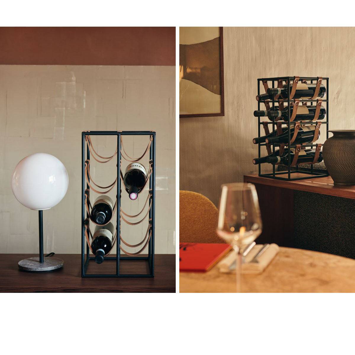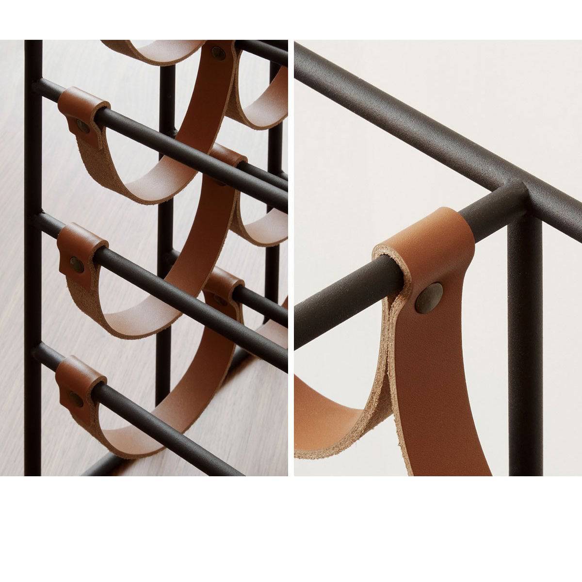 Defined by an elegant contrast between the strict lines of the powder-coated metal frame with the hanging leather straps, the two contrasting materials unite to form a striking structure that can beautifully store and display your wine collection. The leather straps have been strategically placed on the frame to make sure the bottles gently tilt forwards, settling the wine so it touches the cork; ensuring the most perfect drink. Holding up to eight bottles of wine, the rack is ideal for placing in a contemporary kitchen or dining room, or for use in a cluster to create a larger rack in a wine cellar.