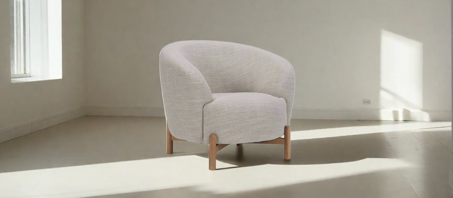 This chic, contemporary armchair features a rounded design with soft lines that invite relaxation and comfort. It stands on sturdy wooden legs, adding a touch of natural warmth that contrasts beautifully with its streamlined silhouette.