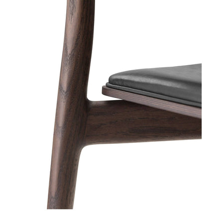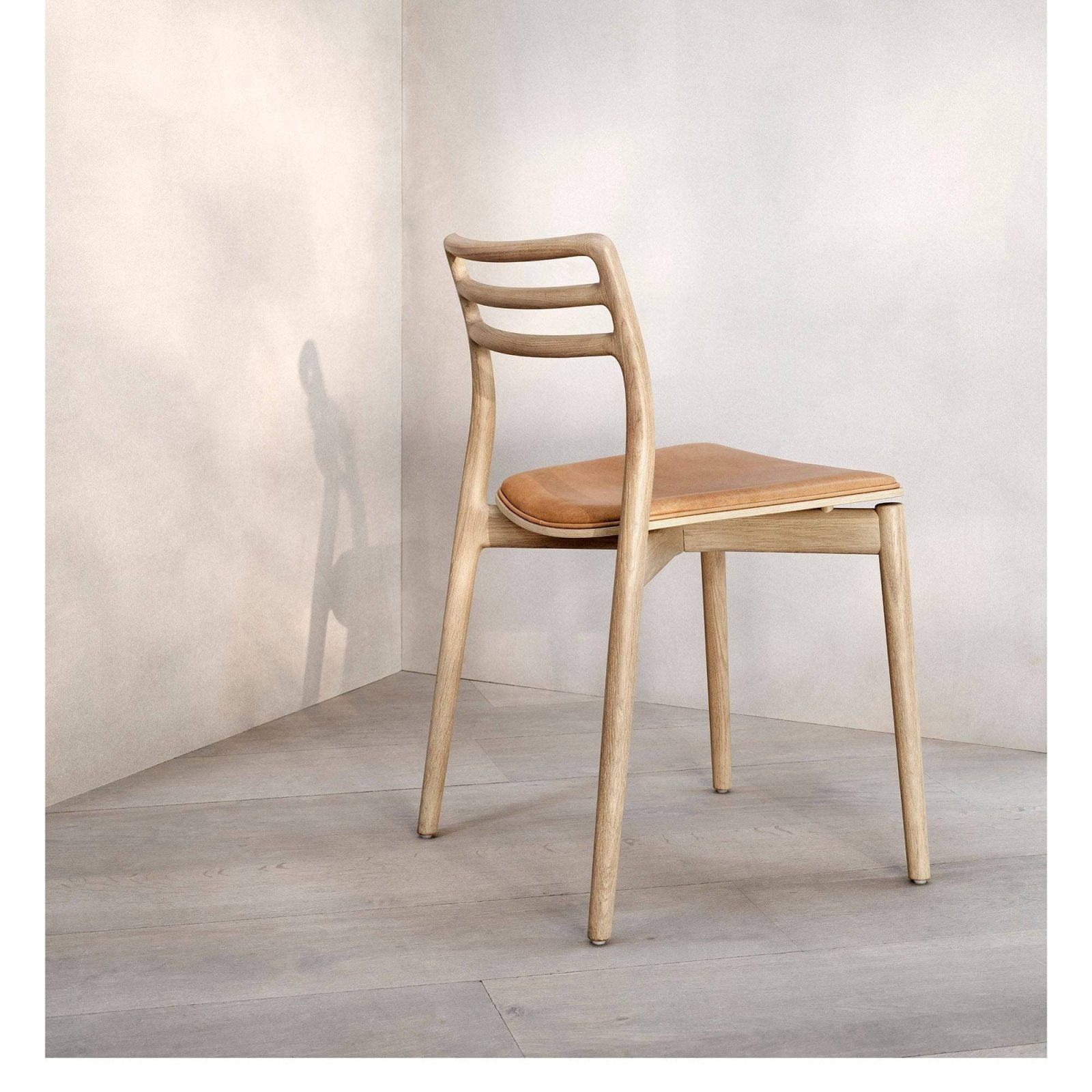 The chair is crafted from solid oak in light or dark finishes, with a hovering veneer seat and optional leather cushion in sand or black.