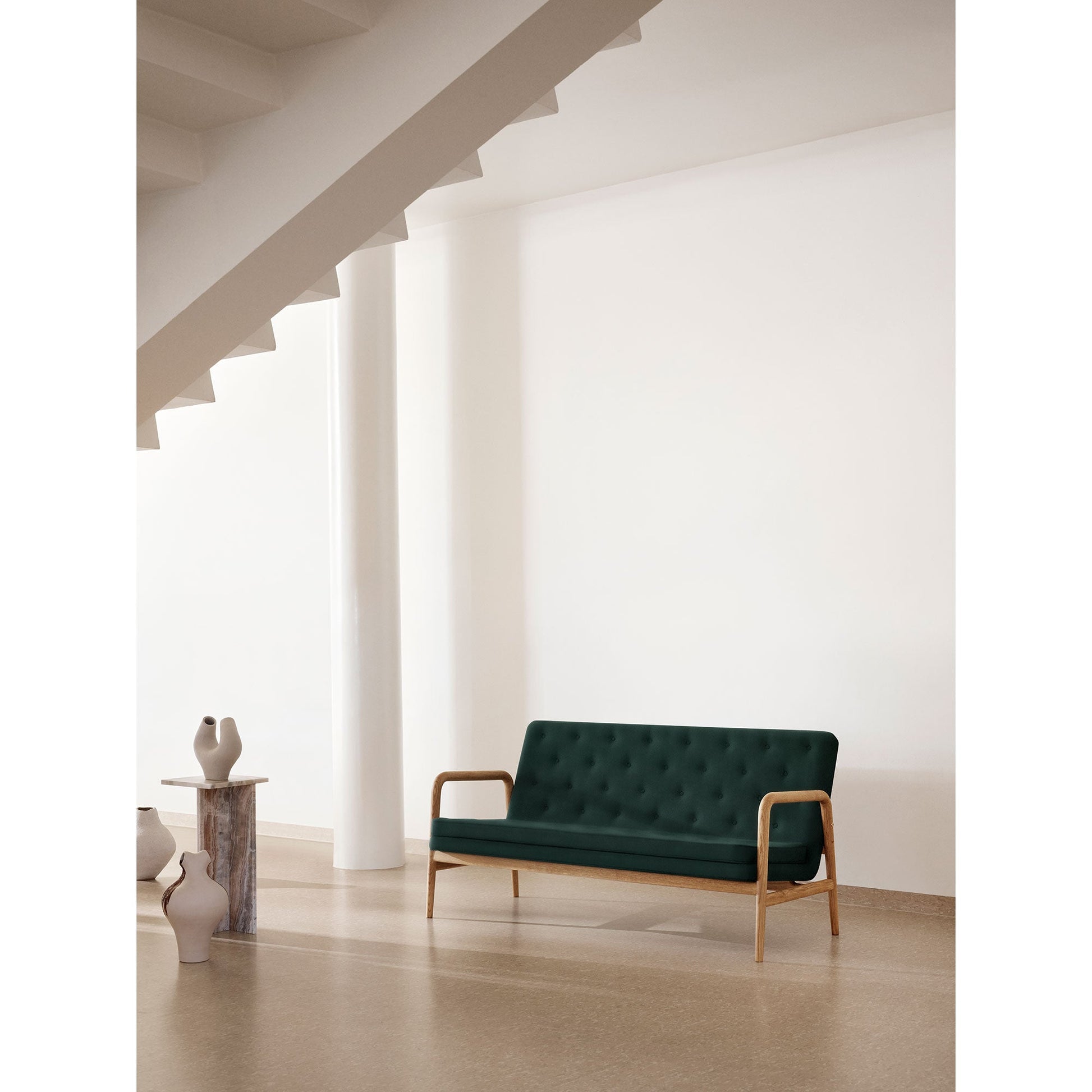 The sofa is crafted from solid oak and upholstered in high-quality leather with handmade buttons.