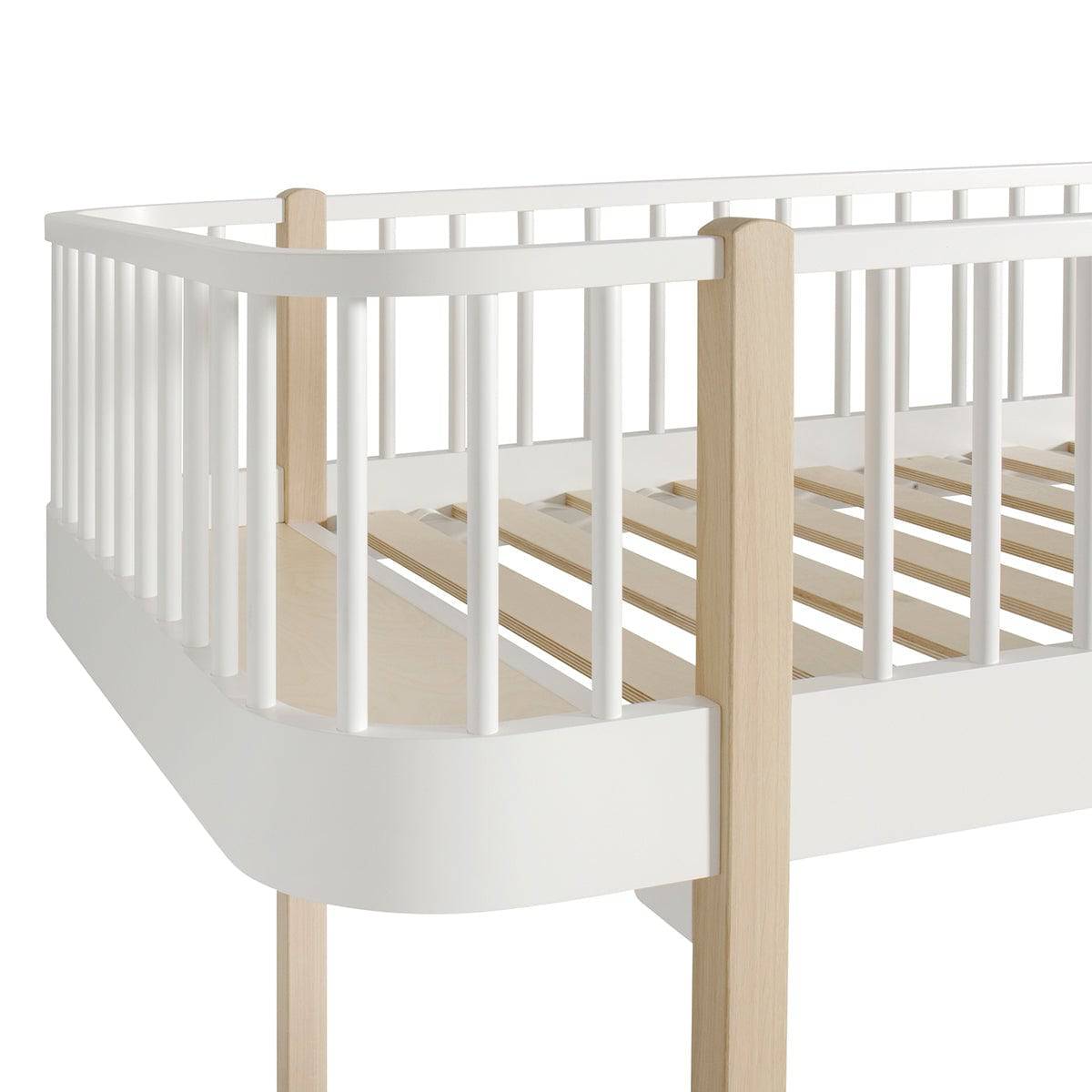 The loft bed can be supplemented with a floor cushion and small table. The Wood loft bed is available in two models; one model with legs in beautiful Nordic oak (white oiled) and a model in all white.